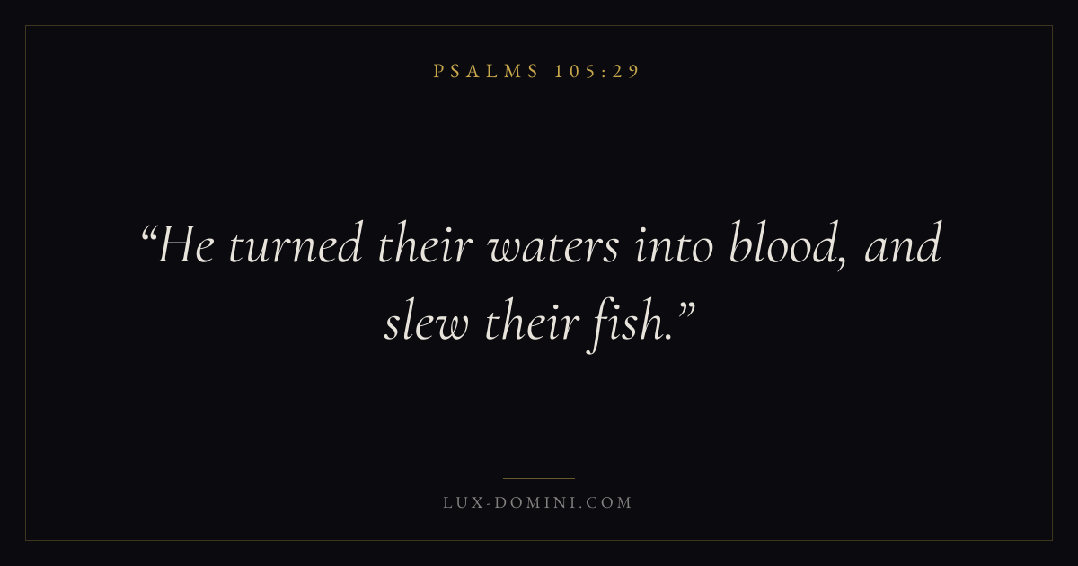 Books / Psalms / Chapter 105 / Verse 29 ← Psalms 105:28 Psalms 105:29 Psalms 105:30 → He turned their waters into blood, and slew their fish. Download verse card Share on Twitter Share on Facebook Pin it ✦ Key themes FaithPrayerSalvationTruthPraise Read with Hebrews 11:1Romans 10:17Matthew 6:9Luke 18:1 Related topics Bible verses about faithBible verses about prayerBible verses about salvationBible verses about truthBible verses about thankfulness and gratitude ✦ Psalms Chapter 105 verses V. 1 V. 2 V. 3 V. 4 V. 5 V. 6 V. 7 V. 8 V. 9 V. 10 V. 11 V. 12 V. 13 V. 14 V. 15 V. 16 V. 17 V. 18 V. 19 V. 20 V. 21 V. 22 V. 23 V. 24 V. 25 V. 26 V. 27 V. 28 V. 29 V. 30 V. 31 V. 32 V. 33 V. 34 V. 35 V. 36 V. 37 V. 38 V. 39 V. 40 V. 41 V. 42 V. 43 V. 44 V. 45