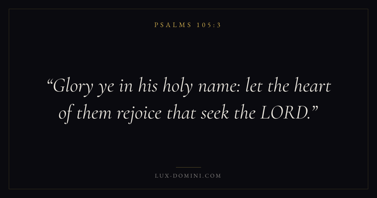 Books / Psalms / Chapter 105 / Verse 3 ← Psalms 105:2 Psalms 105:3 Psalms 105:4 → Glory ye in his holy name: let the heart of them rejoice that seek the LORD. Download verse card Share on Twitter Share on Facebook Pin it ✦ Key themes FaithPrayerGracePraise Read with Hebrews 11:1Romans 10:17Matthew 6:9Luke 18:1 Related topics Bible verses about faithBible verses about prayerBible verses about graceBible verses about thankfulness and gratitude ✦ Psalms Chapter 105 verses V. 1 V. 2 V. 3 V. 4 V. 5 V. 6 V. 7 V. 8 V. 9 V. 10 V. 11 V. 12 V. 13 V. 14 V. 15 V. 16 V. 17 V. 18 V. 19 V. 20 V. 21 V. 22 V. 23 V. 24 V. 25 V. 26 V. 27 V. 28 V. 29 V. 30 V. 31 V. 32 V. 33 V. 34 V. 35 V. 36 V. 37 V. 38 V. 39 V. 40 V. 41 V. 42 V. 43 V. 44 V. 45