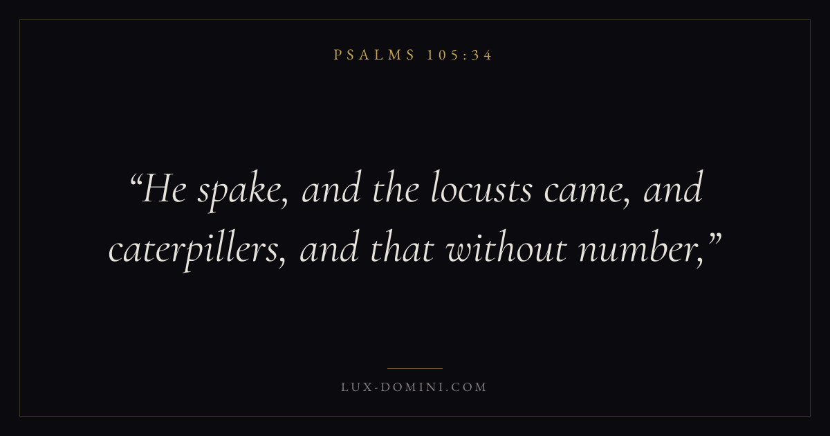 Books / Psalms / Chapter 105 / Verse 34 ← Psalms 105:33 Psalms 105:34 Psalms 105:35 → He spake, and the locusts came, and caterpillers, and that without number, Download verse card Share on Twitter Share on Facebook Pin it ✦ Key themes FaithPrayerSalvationTruthPraise Read with Hebrews 11:1Romans 10:17Matthew 6:9Luke 18:1 Related topics Bible verses about faithBible verses about prayerBible verses about salvationBible verses about truthBible verses about thankfulness and gratitude ✦ Psalms Chapter 105 verses V. 1 V. 2 V. 3 V. 4 V. 5 V. 6 V. 7 V. 8 V. 9 V. 10 V. 11 V. 12 V. 13 V. 14 V. 15 V. 16 V. 17 V. 18 V. 19 V. 20 V. 21 V. 22 V. 23 V. 24 V. 25 V. 26 V. 27 V. 28 V. 29 V. 30 V. 31 V. 32 V. 33 V. 34 V. 35 V. 36 V. 37 V. 38 V. 39 V. 40 V. 41 V. 42 V. 43 V. 44 V. 45