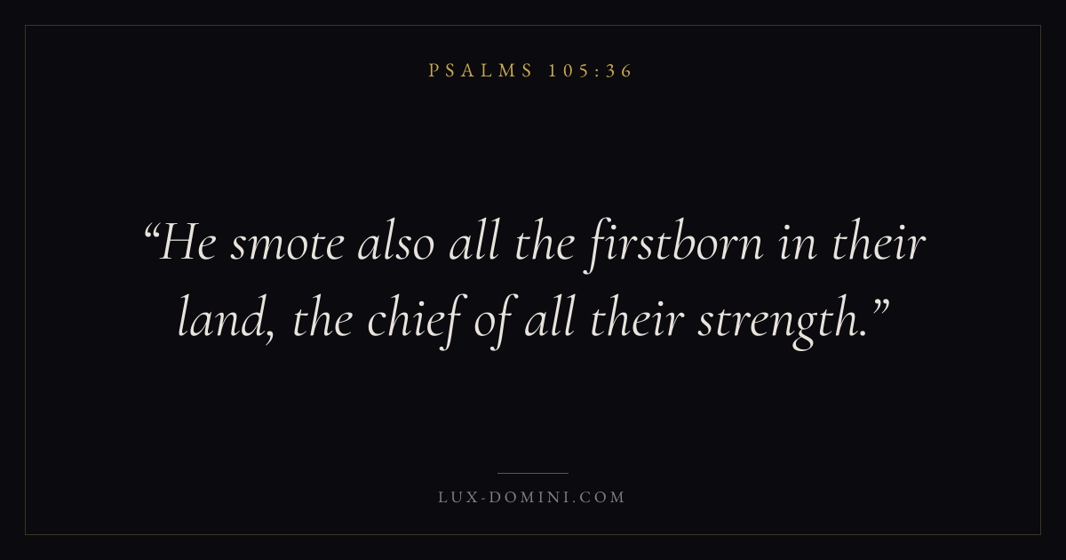 Books / Psalms / Chapter 105 / Verse 36 ← Psalms 105:35 Psalms 105:36 Psalms 105:37 → He smote also all the firstborn in their land, the chief of all their strength. Download verse card Share on Twitter Share on Facebook Pin it ✦ Key themes FaithPrayerSalvationTruthPraise Read with Hebrews 11:1Romans 10:17Matthew 6:9Luke 18:1 Related topics Bible verses about faithBible verses about prayerBible verses about salvationBible verses about truthBible verses about thankfulness and gratitude ✦ Psalms Chapter 105 verses V. 1 V. 2 V. 3 V. 4 V. 5 V. 6 V. 7 V. 8 V. 9 V. 10 V. 11 V. 12 V. 13 V. 14 V. 15 V. 16 V. 17 V. 18 V. 19 V. 20 V. 21 V. 22 V. 23 V. 24 V. 25 V. 26 V. 27 V. 28 V. 29 V. 30 V. 31 V. 32 V. 33 V. 34 V. 35 V. 36 V. 37 V. 38 V. 39 V. 40 V. 41 V. 42 V. 43 V. 44 V. 45