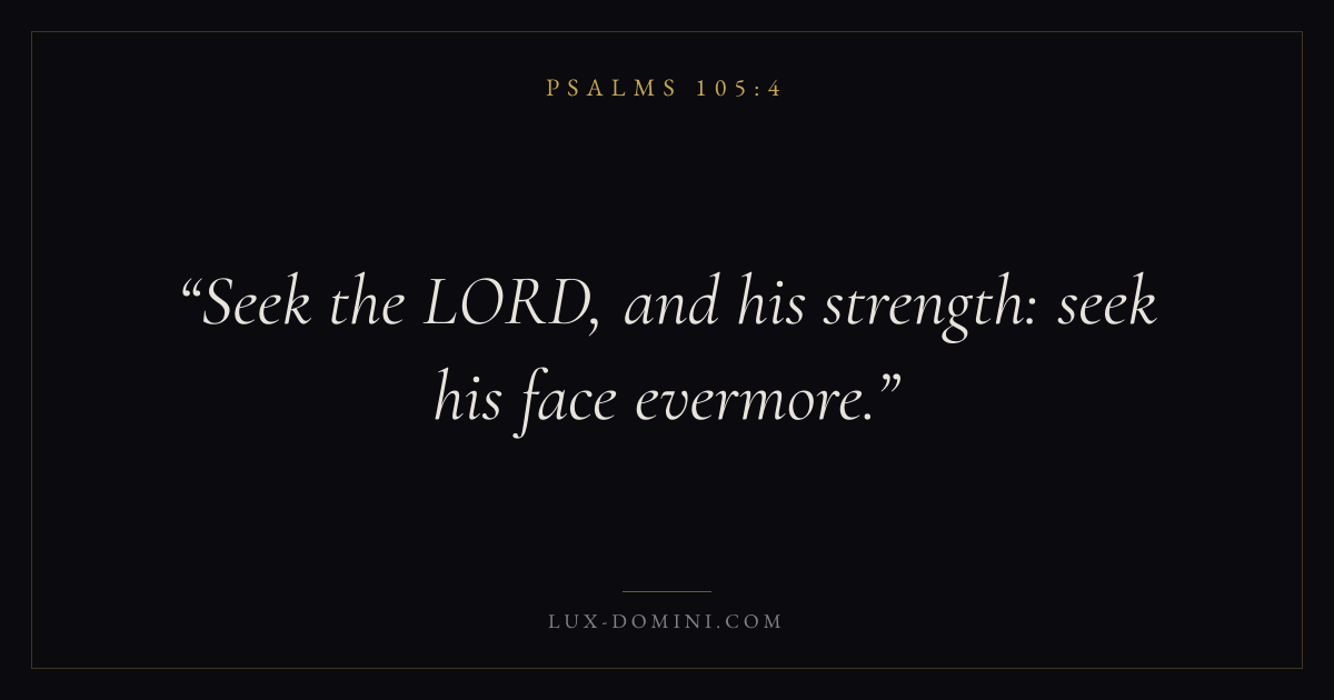 Books / Psalms / Chapter 105 / Verse 4 ← Psalms 105:3 Psalms 105:4 Psalms 105:5 → Seek the LORD, and his strength: seek his face evermore. Download verse card Share on Twitter Share on Facebook Pin it ✦ Key themes FaithPrayerGracePraise Read with Hebrews 11:1Romans 10:17Matthew 6:9Luke 18:1 Related topics Bible verses about faithBible verses about prayerBible verses about graceBible verses about thankfulness and gratitude ✦ Psalms Chapter 105 verses V. 1 V. 2 V. 3 V. 4 V. 5 V. 6 V. 7 V. 8 V. 9 V. 10 V. 11 V. 12 V. 13 V. 14 V. 15 V. 16 V. 17 V. 18 V. 19 V. 20 V. 21 V. 22 V. 23 V. 24 V. 25 V. 26 V. 27 V. 28 V. 29 V. 30 V. 31 V. 32 V. 33 V. 34 V. 35 V. 36 V. 37 V. 38 V. 39 V. 40 V. 41 V. 42 V. 43 V. 44 V. 45
