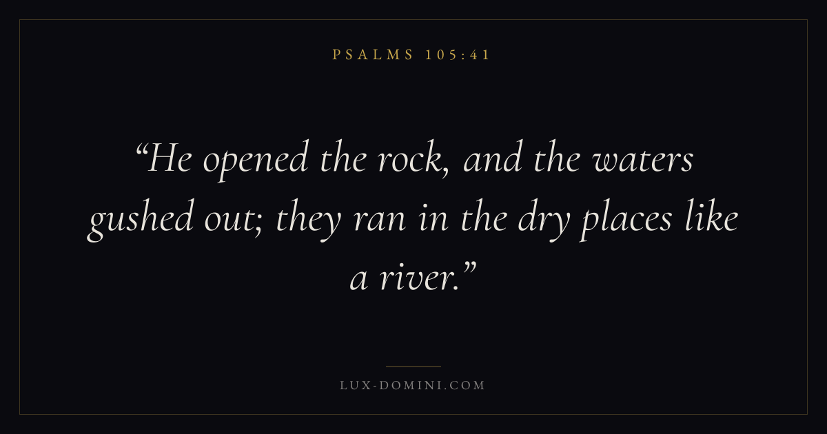 Books / Psalms / Chapter 105 / Verse 41 ← Psalms 105:40 Psalms 105:41 Psalms 105:42 → He opened the rock, and the waters gushed out; they ran in the dry places like a river. Download verse card Share on Twitter Share on Facebook Pin it ✦ Key themes FaithPrayerSalvationTruthPraise Read with Hebrews 11:1Romans 10:17Matthew 6:9Luke 18:1 Related topics Bible verses about faithBible verses about prayerBible verses about salvationBible verses about truthBible verses about thankfulness and gratitude ✦ Psalms Chapter 105 verses V. 1 V. 2 V. 3 V. 4 V. 5 V. 6 V. 7 V. 8 V. 9 V. 10 V. 11 V. 12 V. 13 V. 14 V. 15 V. 16 V. 17 V. 18 V. 19 V. 20 V. 21 V. 22 V. 23 V. 24 V. 25 V. 26 V. 27 V. 28 V. 29 V. 30 V. 31 V. 32 V. 33 V. 34 V. 35 V. 36 V. 37 V. 38 V. 39 V. 40 V. 41 V. 42 V. 43 V. 44 V. 45