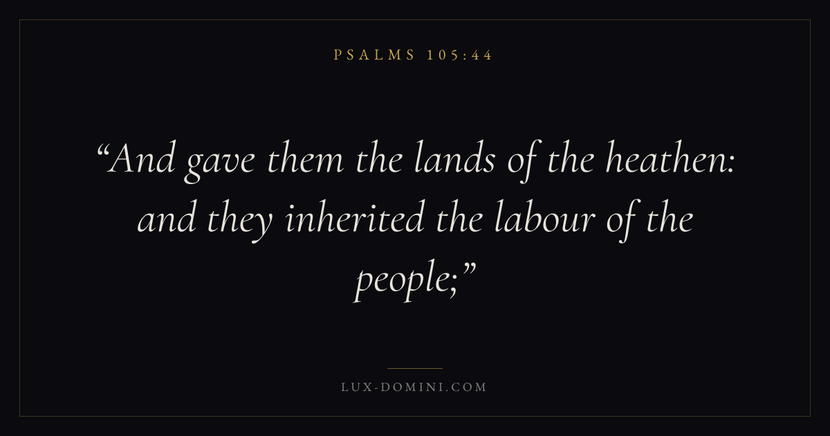Books / Psalms / Chapter 105 / Verse 44 ← Psalms 105:43 Psalms 105:44 Psalms 105:45 → And gave them the lands of the heathen: and they inherited the labour of the people; Download verse card Share on Twitter Share on Facebook Pin it ✦ Key themes FaithPrayerSalvationTruthPraise Read with Hebrews 11:1Romans 10:17Matthew 6:9Luke 18:1 Related topics Bible verses about faithBible verses about prayerBible verses about salvationBible verses about truthBible verses about thankfulness and gratitude ✦ Psalms Chapter 105 verses V. 1 V. 2 V. 3 V. 4 V. 5 V. 6 V. 7 V. 8 V. 9 V. 10 V. 11 V. 12 V. 13 V. 14 V. 15 V. 16 V. 17 V. 18 V. 19 V. 20 V. 21 V. 22 V. 23 V. 24 V. 25 V. 26 V. 27 V. 28 V. 29 V. 30 V. 31 V. 32 V. 33 V. 34 V. 35 V. 36 V. 37 V. 38 V. 39 V. 40 V. 41 V. 42 V. 43 V. 44 V. 45