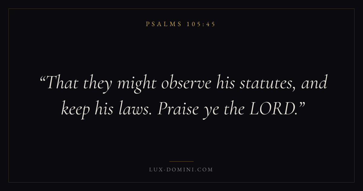 Books / Psalms / Chapter 105 / Verse 45 ← Psalms 105:44 Psalms 105:45 Psalms 106:1 → That they might observe his statutes, and keep his laws. Praise ye the LORD. Download verse card Share on Twitter Share on Facebook Pin it ✦ Key themes FaithPrayerSalvationTruthPraise Read with Hebrews 11:1Romans 10:17Matthew 6:9Luke 18:1 Related topics Bible verses about faithBible verses about prayerBible verses about salvationBible verses about truthBible verses about thankfulness and gratitude ✦ Psalms Chapter 105 verses V. 1 V. 2 V. 3 V. 4 V. 5 V. 6 V. 7 V. 8 V. 9 V. 10 V. 11 V. 12 V. 13 V. 14 V. 15 V. 16 V. 17 V. 18 V. 19 V. 20 V. 21 V. 22 V. 23 V. 24 V. 25 V. 26 V. 27 V. 28 V. 29 V. 30 V. 31 V. 32 V. 33 V. 34 V. 35 V. 36 V. 37 V. 38 V. 39 V. 40 V. 41 V. 42 V. 43 V. 44 V. 45