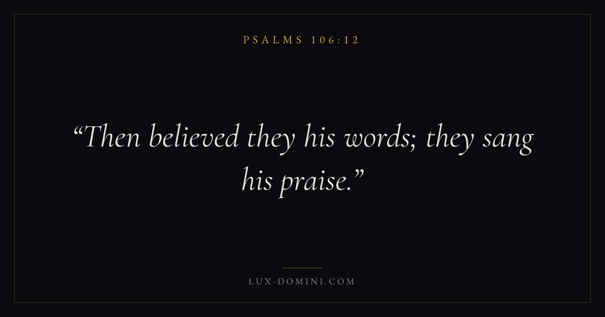 Books / Psalms / Chapter 106 / Verse 12 ← Psalms 106:11 Psalms 106:12 Psalms 106:13 → Then believed they his words; they sang his praise. Download verse card Share on Twitter Share on Facebook Pin it ✦ Key themes FaithHopePrayerPraise Read with Hebrews 11:1Romans 10:17Romans 8:24Revelation 21:4 Related topics Bible verses about faithBible verses about hopeBible verses about prayerBible verses about thankfulness and gratitude ✦ Psalms Chapter 106 verses V. 1 V. 2 V. 3 V. 4 V. 5 V. 6 V. 7 V. 8 V. 9 V. 10 V. 11 V. 12 V. 13 V. 14 V. 15 V. 16 V. 17 V. 18 V. 19 V. 20 V. 21 V. 22 V. 23 V. 24 V. 25 V. 26 V. 27 V. 28 V. 29 V. 30 V. 31 V. 32 V. 33 V. 34 V. 35 V. 36 V. 37 V. 38 V. 39 V. 40 V. 41 V. 42 V. 43 V. 44 V. 45 V. 46 V. 47 V. 48