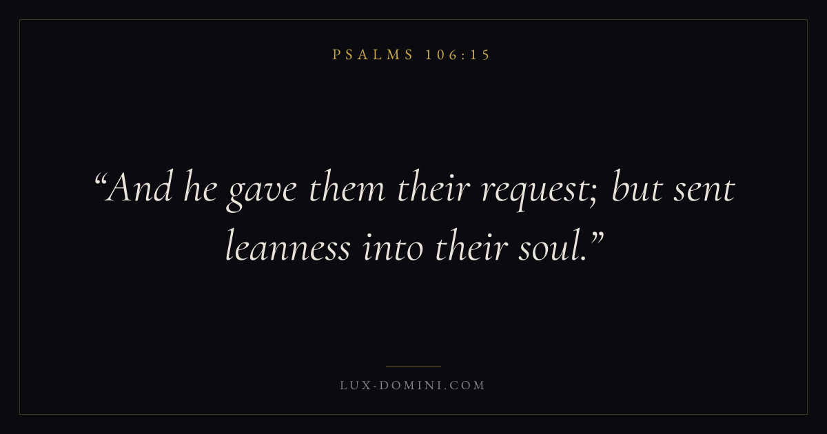 Books / Psalms / Chapter 106 / Verse 15 ← Psalms 106:14 Psalms 106:15 Psalms 106:16 → And he gave them their request; but sent leanness into their soul. Download verse card Share on Twitter Share on Facebook Pin it ✦ Key themes FaithHopePrayerPraise Read with Hebrews 11:1Romans 10:17Romans 8:24Revelation 21:4 Related topics Bible verses about faithBible verses about hopeBible verses about prayerBible verses about thankfulness and gratitude ✦ Psalms Chapter 106 verses V. 1 V. 2 V. 3 V. 4 V. 5 V. 6 V. 7 V. 8 V. 9 V. 10 V. 11 V. 12 V. 13 V. 14 V. 15 V. 16 V. 17 V. 18 V. 19 V. 20 V. 21 V. 22 V. 23 V. 24 V. 25 V. 26 V. 27 V. 28 V. 29 V. 30 V. 31 V. 32 V. 33 V. 34 V. 35 V. 36 V. 37 V. 38 V. 39 V. 40 V. 41 V. 42 V. 43 V. 44 V. 45 V. 46 V. 47 V. 48