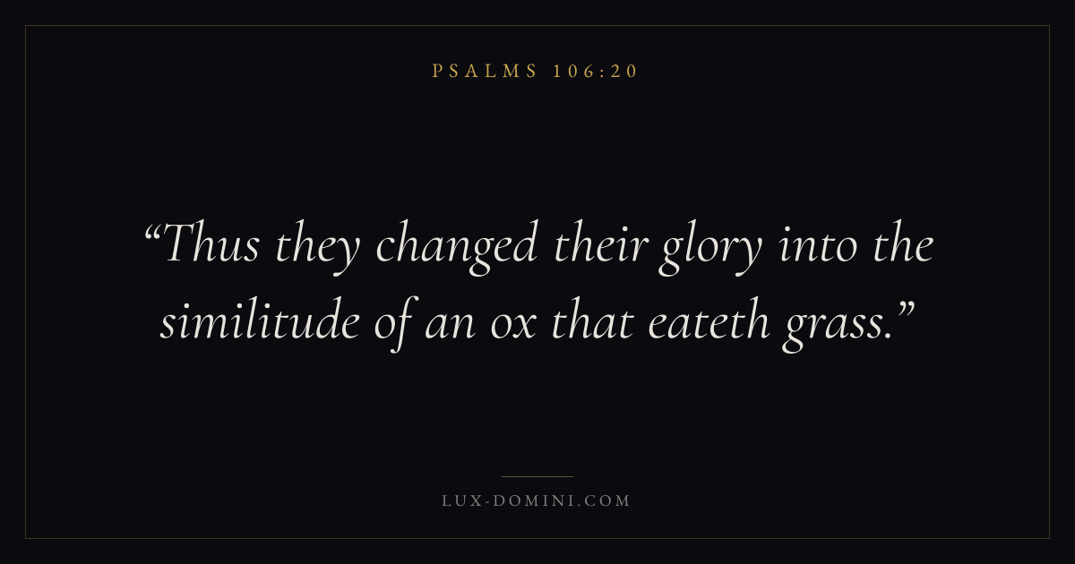 Books / Psalms / Chapter 106 / Verse 20 ← Psalms 106:19 Psalms 106:20 Psalms 106:21 → Thus they changed their glory into the similitude of an ox that eateth grass. Download verse card Share on Twitter Share on Facebook Pin it ✦ Key themes FaithHopePrayerPraise Read with Hebrews 11:1Romans 10:17Romans 8:24Revelation 21:4 Related topics Bible verses about faithBible verses about hopeBible verses about prayerBible verses about thankfulness and gratitude ✦ Psalms Chapter 106 verses V. 1 V. 2 V. 3 V. 4 V. 5 V. 6 V. 7 V. 8 V. 9 V. 10 V. 11 V. 12 V. 13 V. 14 V. 15 V. 16 V. 17 V. 18 V. 19 V. 20 V. 21 V. 22 V. 23 V. 24 V. 25 V. 26 V. 27 V. 28 V. 29 V. 30 V. 31 V. 32 V. 33 V. 34 V. 35 V. 36 V. 37 V. 38 V. 39 V. 40 V. 41 V. 42 V. 43 V. 44 V. 45 V. 46 V. 47 V. 48
