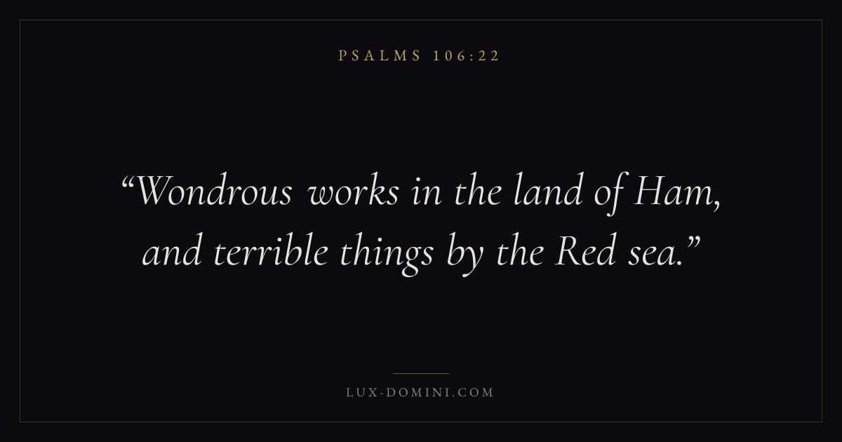 Books / Psalms / Chapter 106 / Verse 22 ← Psalms 106:21 Psalms 106:22 Psalms 106:23 → Wondrous works in the land of Ham, and terrible things by the Red sea. Download verse card Share on Twitter Share on Facebook Pin it ✦ Key themes FaithHopePrayerPraise Read with Hebrews 11:1Romans 10:17Romans 8:24Revelation 21:4 Related topics Bible verses about faithBible verses about hopeBible verses about prayerBible verses about thankfulness and gratitude Glossary Red Sea Place Biblical body of water. Modern identification: Gulf of Suez. Ham Place Biblical region. Modern identification: Ain Shams. ✦ Psalms Chapter 106 verses V. 1 V. 2 V. 3 V. 4 V. 5 V. 6 V. 7 V. 8 V. 9 V. 10 V. 11 V. 12 V. 13 V. 14 V. 15 V. 16 V. 17 V. 18 V. 19 V. 20 V. 21 V. 22 V. 23 V. 24 V. 25 V. 26 V. 27 V. 28 V. 29 V. 30 V. 31 V. 32 V. 33 V. 34 V. 35 V. 36 V. 37 V. 38 V. 39 V. 40 V. 41 V. 42 V. 43 V. 44 V. 45 V. 46 V. 47 V. 48