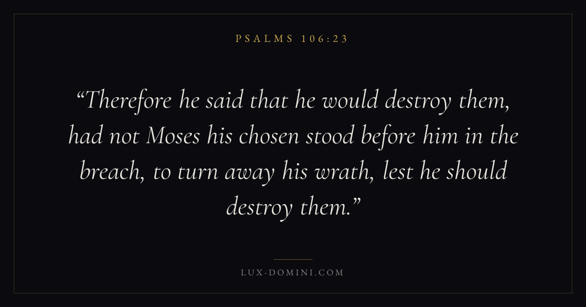 Therefore he said that he would destroy them, had not Moses his chosen stood before him in the breach, to turn away his wrath, lest he should destroy them.