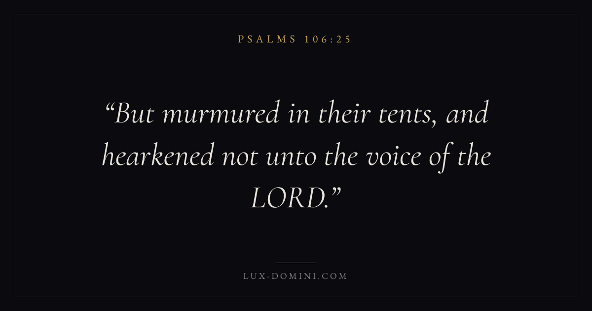 Books / Psalms / Chapter 106 / Verse 25 ← Psalms 106:24 Psalms 106:25 Psalms 106:26 → But murmured in their tents, and hearkened not unto the voice of the LORD. Download verse card Share on Twitter Share on Facebook Pin it ✦ Key themes FaithHopePrayerPraise Read with Hebrews 11:1Romans 10:17Romans 8:24Revelation 21:4 Related topics Bible verses about faithBible verses about hopeBible verses about prayerBible verses about thankfulness and gratitude ✦ Psalms Chapter 106 verses V. 1 V. 2 V. 3 V. 4 V. 5 V. 6 V. 7 V. 8 V. 9 V. 10 V. 11 V. 12 V. 13 V. 14 V. 15 V. 16 V. 17 V. 18 V. 19 V. 20 V. 21 V. 22 V. 23 V. 24 V. 25 V. 26 V. 27 V. 28 V. 29 V. 30 V. 31 V. 32 V. 33 V. 34 V. 35 V. 36 V. 37 V. 38 V. 39 V. 40 V. 41 V. 42 V. 43 V. 44 V. 45 V. 46 V. 47 V. 48