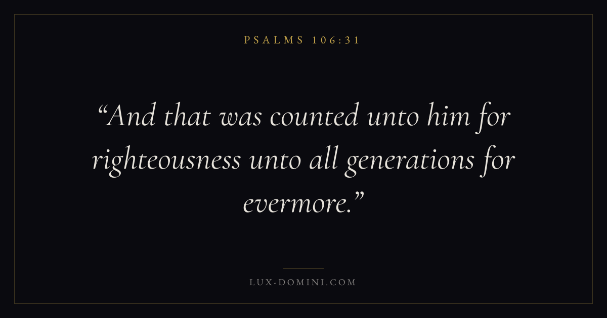 Books / Psalms / Chapter 106 / Verse 31 ← Psalms 106:30 Psalms 106:31 Psalms 106:32 → And that was counted unto him for righteousness unto all generations for evermore. Download verse card Share on Twitter Share on Facebook Pin it ✦ Key themes FaithHopePrayerPraise Read with Hebrews 11:1Romans 10:17Romans 8:24Revelation 21:4 Related topics Bible verses about faithBible verses about hopeBible verses about prayerBible verses about thankfulness and gratitude ✦ Psalms Chapter 106 verses V. 1 V. 2 V. 3 V. 4 V. 5 V. 6 V. 7 V. 8 V. 9 V. 10 V. 11 V. 12 V. 13 V. 14 V. 15 V. 16 V. 17 V. 18 V. 19 V. 20 V. 21 V. 22 V. 23 V. 24 V. 25 V. 26 V. 27 V. 28 V. 29 V. 30 V. 31 V. 32 V. 33 V. 34 V. 35 V. 36 V. 37 V. 38 V. 39 V. 40 V. 41 V. 42 V. 43 V. 44 V. 45 V. 46 V. 47 V. 48