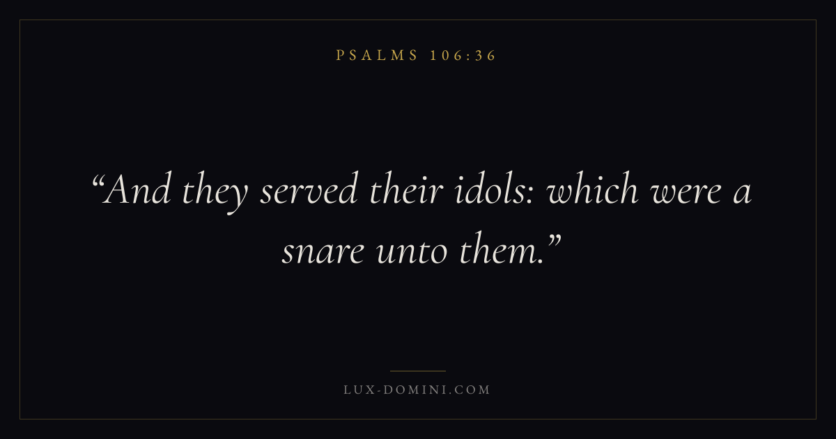 Books / Psalms / Chapter 106 / Verse 36 ← Psalms 106:35 Psalms 106:36 Psalms 106:37 → And they served their idols: which were a snare unto them. Download verse card Share on Twitter Share on Facebook Pin it ✦ Key themes FaithPrayerPraiseLament Read with Hebrews 11:1Romans 10:17Matthew 6:9Luke 18:1 Related topics Bible verses about faithBible verses about prayerBible verses about thankfulness and gratitudeBible verses about grief and loss ✦ Psalms Chapter 106 verses V. 1 V. 2 V. 3 V. 4 V. 5 V. 6 V. 7 V. 8 V. 9 V. 10 V. 11 V. 12 V. 13 V. 14 V. 15 V. 16 V. 17 V. 18 V. 19 V. 20 V. 21 V. 22 V. 23 V. 24 V. 25 V. 26 V. 27 V. 28 V. 29 V. 30 V. 31 V. 32 V. 33 V. 34 V. 35 V. 36 V. 37 V. 38 V. 39 V. 40 V. 41 V. 42 V. 43 V. 44 V. 45 V. 46 V. 47 V. 48
