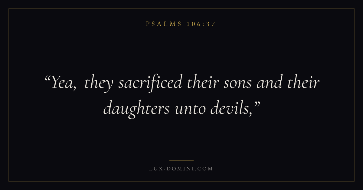 Books / Psalms / Chapter 106 / Verse 37 ← Psalms 106:36 Psalms 106:37 Psalms 106:38 → Yea, they sacrificed their sons and their daughters unto devils, Download verse card Share on Twitter Share on Facebook Pin it ✦ Key themes FaithPrayerPraiseLament Read with Hebrews 11:1Romans 10:17Matthew 6:9Luke 18:1 Related topics Bible verses about faithBible verses about prayerBible verses about thankfulness and gratitudeBible verses about grief and loss ✦ Psalms Chapter 106 verses V. 1 V. 2 V. 3 V. 4 V. 5 V. 6 V. 7 V. 8 V. 9 V. 10 V. 11 V. 12 V. 13 V. 14 V. 15 V. 16 V. 17 V. 18 V. 19 V. 20 V. 21 V. 22 V. 23 V. 24 V. 25 V. 26 V. 27 V. 28 V. 29 V. 30 V. 31 V. 32 V. 33 V. 34 V. 35 V. 36 V. 37 V. 38 V. 39 V. 40 V. 41 V. 42 V. 43 V. 44 V. 45 V. 46 V. 47 V. 48