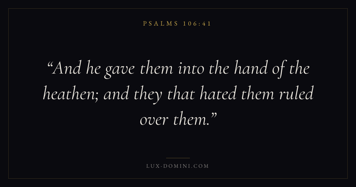 Books / Psalms / Chapter 106 / Verse 41 ← Psalms 106:40 Psalms 106:41 Psalms 106:42 → And he gave them into the hand of the heathen; and they that hated them ruled over them. Download verse card Share on Twitter Share on Facebook Pin it ✦ Key themes FaithPrayerPraiseLament Read with Hebrews 11:1Romans 10:17Matthew 6:9Luke 18:1 Related topics Bible verses about faithBible verses about prayerBible verses about thankfulness and gratitudeBible verses about grief and loss ✦ Psalms Chapter 106 verses V. 1 V. 2 V. 3 V. 4 V. 5 V. 6 V. 7 V. 8 V. 9 V. 10 V. 11 V. 12 V. 13 V. 14 V. 15 V. 16 V. 17 V. 18 V. 19 V. 20 V. 21 V. 22 V. 23 V. 24 V. 25 V. 26 V. 27 V. 28 V. 29 V. 30 V. 31 V. 32 V. 33 V. 34 V. 35 V. 36 V. 37 V. 38 V. 39 V. 40 V. 41 V. 42 V. 43 V. 44 V. 45 V. 46 V. 47 V. 48
