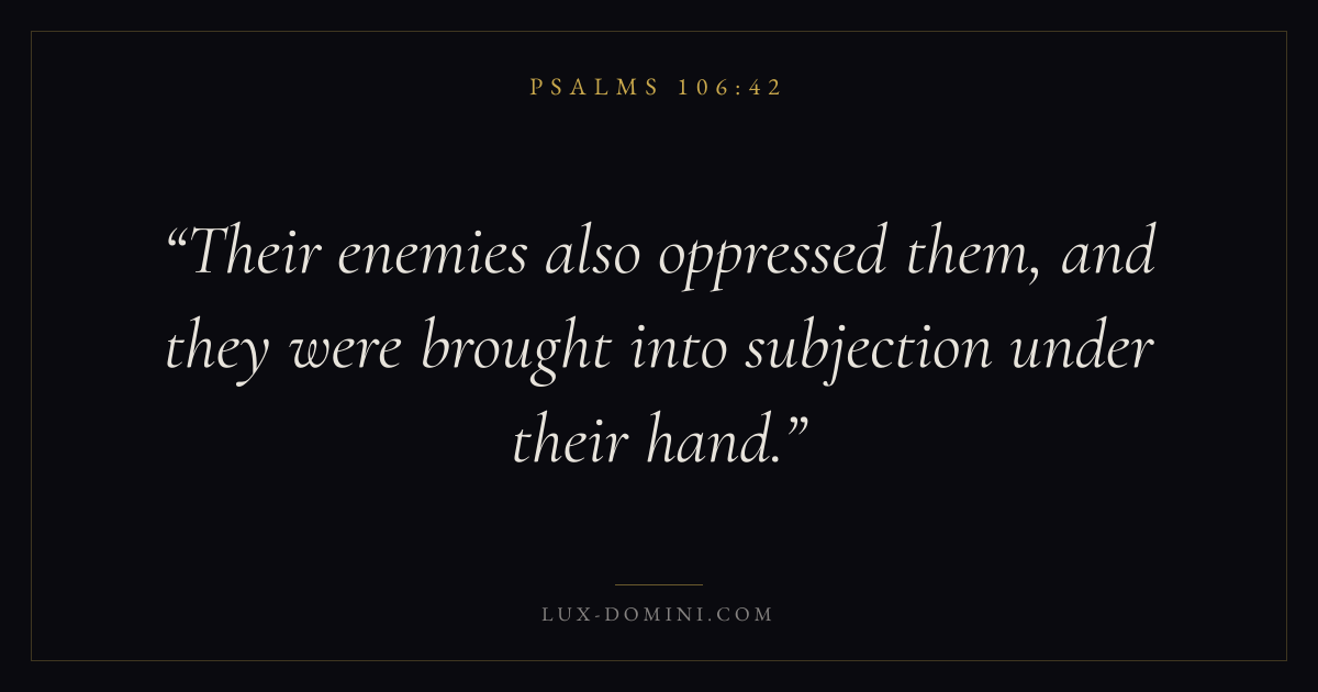 Books / Psalms / Chapter 106 / Verse 42 ← Psalms 106:41 Psalms 106:42 Psalms 106:43 → Their enemies also oppressed them, and they were brought into subjection under their hand. Download verse card Share on Twitter Share on Facebook Pin it ✦ Key themes FaithPrayerPraiseLament Read with Hebrews 11:1Romans 10:17Matthew 6:9Luke 18:1 Related topics Bible verses about faithBible verses about prayerBible verses about thankfulness and gratitudeBible verses about grief and loss ✦ Psalms Chapter 106 verses V. 1 V. 2 V. 3 V. 4 V. 5 V. 6 V. 7 V. 8 V. 9 V. 10 V. 11 V. 12 V. 13 V. 14 V. 15 V. 16 V. 17 V. 18 V. 19 V. 20 V. 21 V. 22 V. 23 V. 24 V. 25 V. 26 V. 27 V. 28 V. 29 V. 30 V. 31 V. 32 V. 33 V. 34 V. 35 V. 36 V. 37 V. 38 V. 39 V. 40 V. 41 V. 42 V. 43 V. 44 V. 45 V. 46 V. 47 V. 48