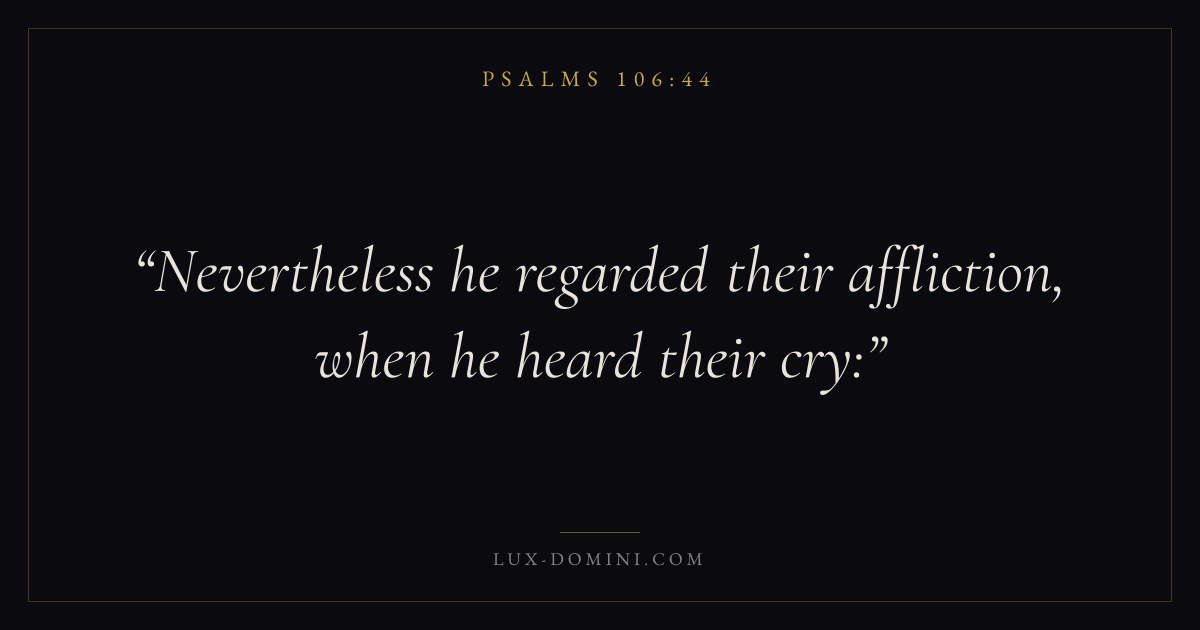 Books / Psalms / Chapter 106 / Verse 44 ← Psalms 106:43 Psalms 106:44 Psalms 106:45 → Nevertheless he regarded their affliction, when he heard their cry: Download verse card Share on Twitter Share on Facebook Pin it ✦ Key themes FaithSuffering and trialsPrayerPraise Read with Hebrews 11:1Romans 10:17Romans 8:182 Corinthians 4:17 Related topics Bible verses about faithBible verses about suffering and trialsBible verses about prayerBible verses about thankfulness and gratitude ✦ Psalms Chapter 106 verses V. 1 V. 2 V. 3 V. 4 V. 5 V. 6 V. 7 V. 8 V. 9 V. 10 V. 11 V. 12 V. 13 V. 14 V. 15 V. 16 V. 17 V. 18 V. 19 V. 20 V. 21 V. 22 V. 23 V. 24 V. 25 V. 26 V. 27 V. 28 V. 29 V. 30 V. 31 V. 32 V. 33 V. 34 V. 35 V. 36 V. 37 V. 38 V. 39 V. 40 V. 41 V. 42 V. 43 V. 44 V. 45 V. 46 V. 47 V. 48