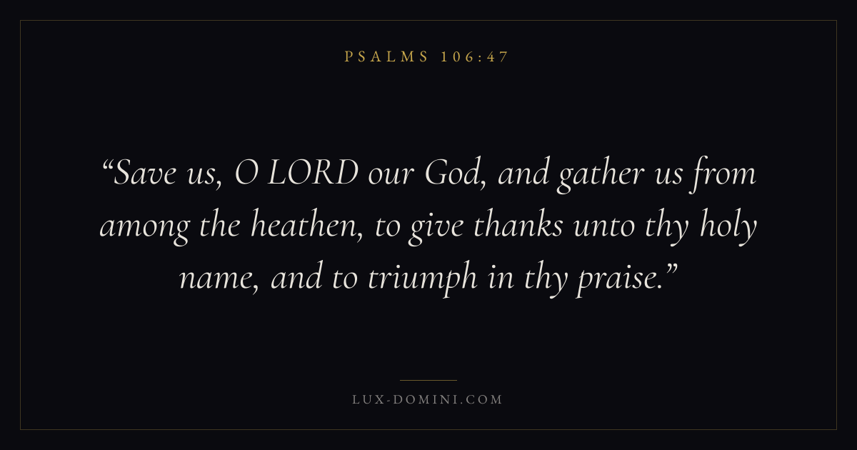 Save us, O LORD our God, and gather us from among the heathen, to give thanks unto thy holy name, and to triumph in thy praise.