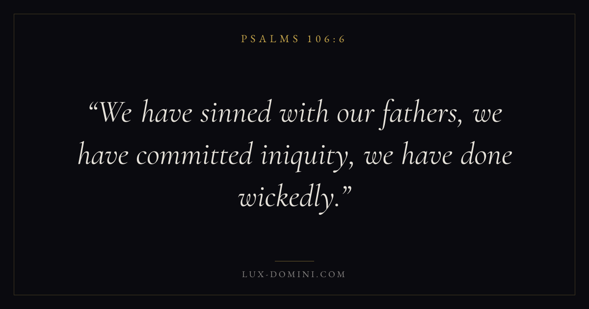 Books / Psalms / Chapter 106 / Verse 6 ← Psalms 106:5 Psalms 106:6 Psalms 106:7 → We have sinned with our fathers, we have committed iniquity, we have done wickedly. Download verse card Share on Twitter Share on Facebook Pin it ✦ Key themes FaithHopePrayerPraise Read with Hebrews 11:1Romans 10:17Romans 8:24Revelation 21:4 Related topics Bible verses about faithBible verses about hopeBible verses about prayerBible verses about thankfulness and gratitude ✦ Psalms Chapter 106 verses V. 1 V. 2 V. 3 V. 4 V. 5 V. 6 V. 7 V. 8 V. 9 V. 10 V. 11 V. 12 V. 13 V. 14 V. 15 V. 16 V. 17 V. 18 V. 19 V. 20 V. 21 V. 22 V. 23 V. 24 V. 25 V. 26 V. 27 V. 28 V. 29 V. 30 V. 31 V. 32 V. 33 V. 34 V. 35 V. 36 V. 37 V. 38 V. 39 V. 40 V. 41 V. 42 V. 43 V. 44 V. 45 V. 46 V. 47 V. 48