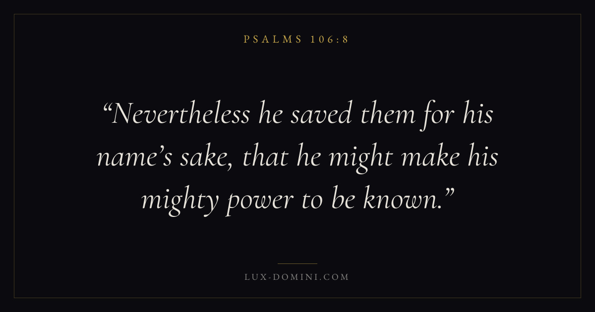 Books / Psalms / Chapter 106 / Verse 8 ← Psalms 106:7 Psalms 106:8 Psalms 106:9 → Nevertheless he saved them for his name’s sake, that he might make his mighty power to be known. Download verse card Share on Twitter Share on Facebook Pin it ✦ Key themes FaithHopePrayerSalvationPraise Read with Hebrews 11:1Romans 10:17Romans 8:24Revelation 21:4 Related topics Bible verses about faithBible verses about hopeBible verses about prayerBible verses about salvationBible verses about thankfulness and gratitude ✦ Psalms Chapter 106 verses V. 1 V. 2 V. 3 V. 4 V. 5 V. 6 V. 7 V. 8 V. 9 V. 10 V. 11 V. 12 V. 13 V. 14 V. 15 V. 16 V. 17 V. 18 V. 19 V. 20 V. 21 V. 22 V. 23 V. 24 V. 25 V. 26 V. 27 V. 28 V. 29 V. 30 V. 31 V. 32 V. 33 V. 34 V. 35 V. 36 V. 37 V. 38 V. 39 V. 40 V. 41 V. 42 V. 43 V. 44 V. 45 V. 46 V. 47 V. 48