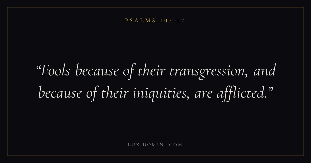 Books / Psalms / Chapter 107 / Verse 17 ← Psalms 107:16 Psalms 107:17 Psalms 107:18 → Fools because of their transgression, and because of their iniquities, are afflicted. Download verse card Share on Twitter Share on Facebook Pin it ✦ Key themes FaithSuffering and trialsPrayerPraise Read with Hebrews 11:1Romans 10:17Romans 8:182 Corinthians 4:17 Related topics Bible verses about faithBible verses about suffering and trialsBible verses about prayerBible verses about thankfulness and gratitude ✦ Psalms Chapter 107 verses V. 1 V. 2 V. 3 V. 4 V. 5 V. 6 V. 7 V. 8 V. 9 V. 10 V. 11 V. 12 V. 13 V. 14 V. 15 V. 16 V. 17 V. 18 V. 19 V. 20 V. 21 V. 22 V. 23 V. 24 V. 25 V. 26 V. 27 V. 28 V. 29 V. 30 V. 31 V. 32 V. 33 V. 34 V. 35 V. 36 V. 37 V. 38 V. 39 V. 40 V. 41 V. 42 V. 43