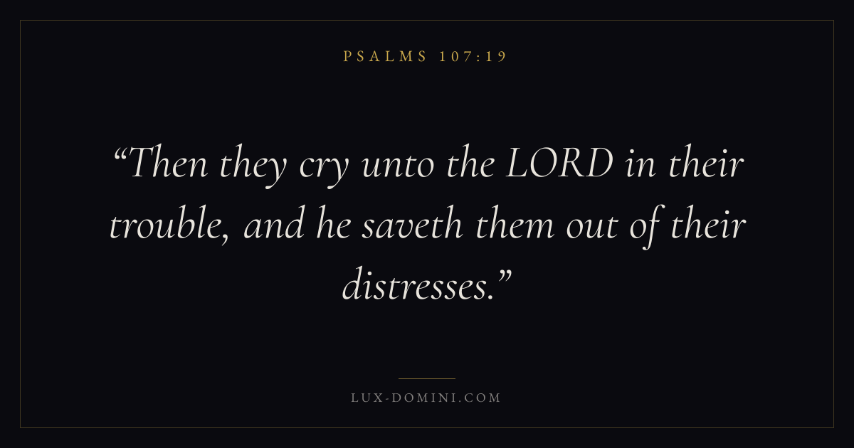 Books / Psalms / Chapter 107 / Verse 19 ← Psalms 107:18 Psalms 107:19 Psalms 107:20 → Then they cry unto the LORD in their trouble, and he saveth them out of their distresses. Download verse card Share on Twitter Share on Facebook Pin it ✦ Key themes FaithPrayerPraiseLament Read with Hebrews 11:1Romans 10:17Matthew 6:9Luke 18:1 Related topics Bible verses about faithBible verses about prayerBible verses about thankfulness and gratitudeBible verses about grief and loss ✦ Psalms Chapter 107 verses V. 1 V. 2 V. 3 V. 4 V. 5 V. 6 V. 7 V. 8 V. 9 V. 10 V. 11 V. 12 V. 13 V. 14 V. 15 V. 16 V. 17 V. 18 V. 19 V. 20 V. 21 V. 22 V. 23 V. 24 V. 25 V. 26 V. 27 V. 28 V. 29 V. 30 V. 31 V. 32 V. 33 V. 34 V. 35 V. 36 V. 37 V. 38 V. 39 V. 40 V. 41 V. 42 V. 43