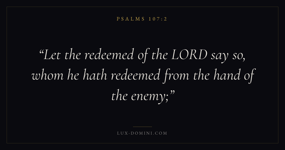 Books / Psalms / Chapter 107 / Verse 2 ← Psalms 107:1 Psalms 107:2 Psalms 107:3 → Let the redeemed of the LORD say so, whom he hath redeemed from the hand of the enemy; Download verse card Share on Twitter Share on Facebook Pin it ✦ Key themes FaithPrayerSalvationPraise Read with Hebrews 11:1Romans 10:17Matthew 6:9Luke 18:1 Related topics Bible verses about faithBible verses about prayerBible verses about salvationBible verses about thankfulness and gratitude ✦ Psalms Chapter 107 verses V. 1 V. 2 V. 3 V. 4 V. 5 V. 6 V. 7 V. 8 V. 9 V. 10 V. 11 V. 12 V. 13 V. 14 V. 15 V. 16 V. 17 V. 18 V. 19 V. 20 V. 21 V. 22 V. 23 V. 24 V. 25 V. 26 V. 27 V. 28 V. 29 V. 30 V. 31 V. 32 V. 33 V. 34 V. 35 V. 36 V. 37 V. 38 V. 39 V. 40 V. 41 V. 42 V. 43