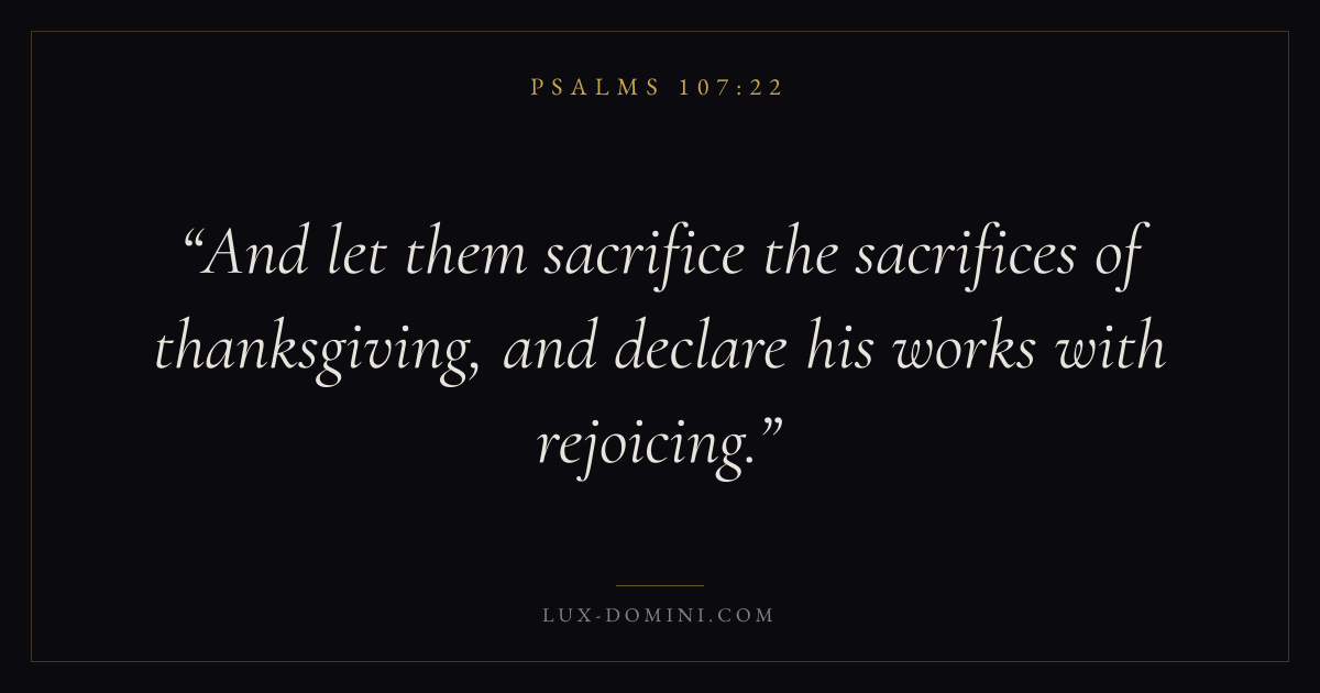 Books / Psalms / Chapter 107 / Verse 22 ← Psalms 107:21 Psalms 107:22 Psalms 107:23 → And let them sacrifice the sacrifices of thanksgiving, and declare his works with rejoicing. Download verse card Share on Twitter Share on Facebook Pin it ✦ Key themes FaithPrayerPraiseLament Read with Hebrews 11:1Romans 10:17Matthew 6:9Luke 18:1 Related topics Bible verses about faithBible verses about prayerBible verses about thankfulness and gratitudeBible verses about grief and loss ✦ Psalms Chapter 107 verses V. 1 V. 2 V. 3 V. 4 V. 5 V. 6 V. 7 V. 8 V. 9 V. 10 V. 11 V. 12 V. 13 V. 14 V. 15 V. 16 V. 17 V. 18 V. 19 V. 20 V. 21 V. 22 V. 23 V. 24 V. 25 V. 26 V. 27 V. 28 V. 29 V. 30 V. 31 V. 32 V. 33 V. 34 V. 35 V. 36 V. 37 V. 38 V. 39 V. 40 V. 41 V. 42 V. 43