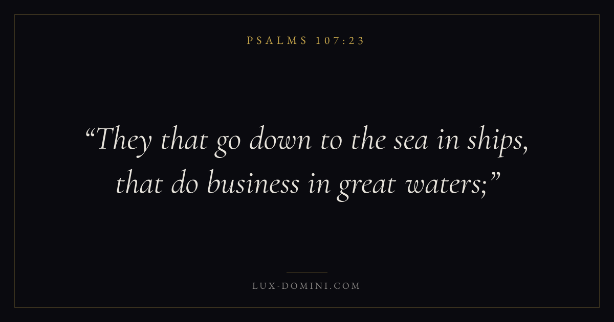 Books / Psalms / Chapter 107 / Verse 23 ← Psalms 107:22 Psalms 107:23 Psalms 107:24 → They that go down to the sea in ships, that do business in great waters; Download verse card Share on Twitter Share on Facebook Pin it ✦ Key themes FaithPrayerTruthPraise Read with Hebrews 11:1Romans 10:17Matthew 6:9Luke 18:1 Related topics Bible verses about faithBible verses about prayerBible verses about truthBible verses about thankfulness and gratitude ✦ Psalms Chapter 107 verses V. 1 V. 2 V. 3 V. 4 V. 5 V. 6 V. 7 V. 8 V. 9 V. 10 V. 11 V. 12 V. 13 V. 14 V. 15 V. 16 V. 17 V. 18 V. 19 V. 20 V. 21 V. 22 V. 23 V. 24 V. 25 V. 26 V. 27 V. 28 V. 29 V. 30 V. 31 V. 32 V. 33 V. 34 V. 35 V. 36 V. 37 V. 38 V. 39 V. 40 V. 41 V. 42 V. 43