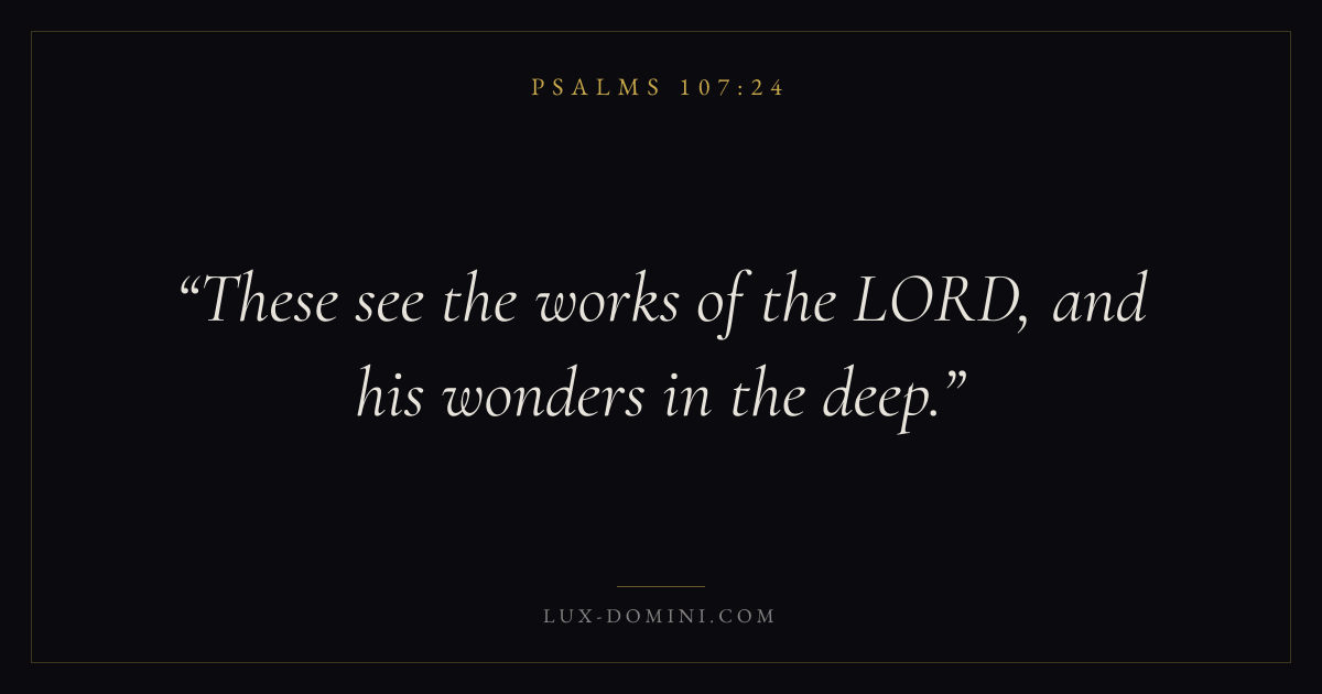 Books / Psalms / Chapter 107 / Verse 24 ← Psalms 107:23 Psalms 107:24 Psalms 107:25 → These see the works of the LORD, and his wonders in the deep. Download verse card Share on Twitter Share on Facebook Pin it ✦ Key themes FaithPrayerTruthPraise Read with Hebrews 11:1Romans 10:17Matthew 6:9Luke 18:1 Related topics Bible verses about faithBible verses about prayerBible verses about truthBible verses about thankfulness and gratitude ✦ Psalms Chapter 107 verses V. 1 V. 2 V. 3 V. 4 V. 5 V. 6 V. 7 V. 8 V. 9 V. 10 V. 11 V. 12 V. 13 V. 14 V. 15 V. 16 V. 17 V. 18 V. 19 V. 20 V. 21 V. 22 V. 23 V. 24 V. 25 V. 26 V. 27 V. 28 V. 29 V. 30 V. 31 V. 32 V. 33 V. 34 V. 35 V. 36 V. 37 V. 38 V. 39 V. 40 V. 41 V. 42 V. 43
