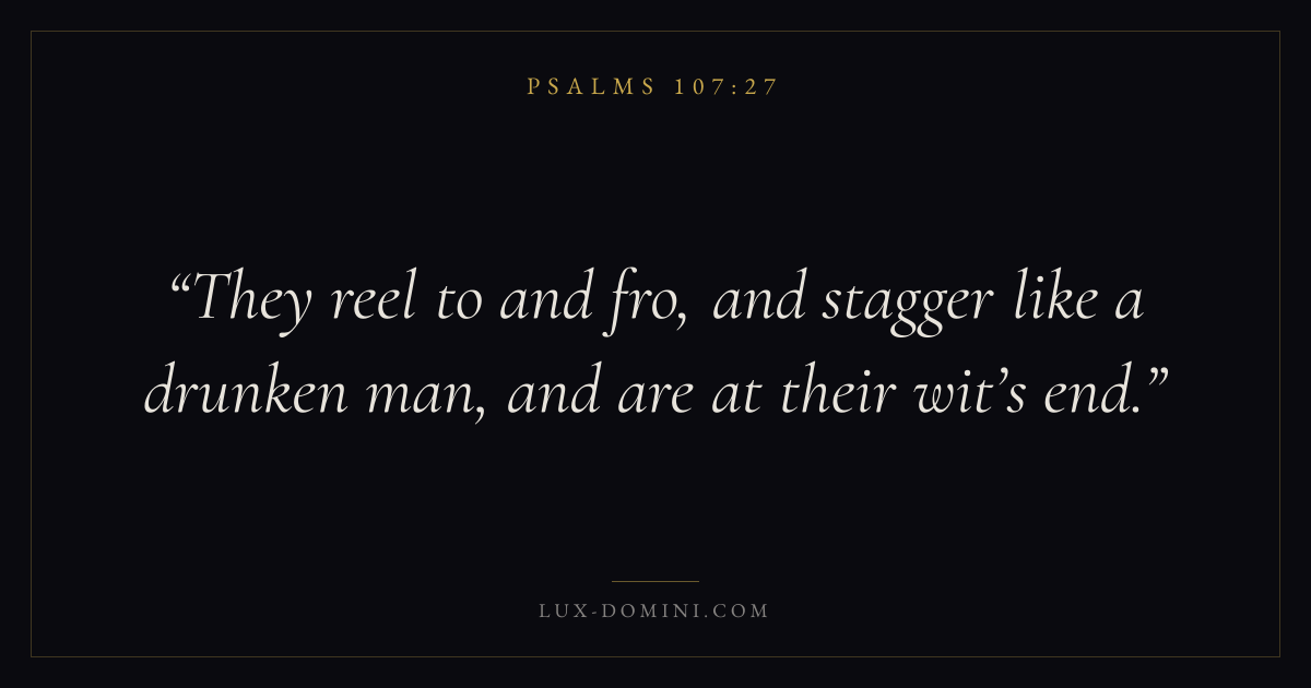 Books / Psalms / Chapter 107 / Verse 27 ← Psalms 107:26 Psalms 107:27 Psalms 107:28 → They reel to and fro, and stagger like a drunken man, and are at their wit’s end. Download verse card Share on Twitter Share on Facebook Pin it ✦ Key themes FaithPrayerTruthPraise Read with Hebrews 11:1Romans 10:17Matthew 6:9Luke 18:1 Related topics Bible verses about faithBible verses about prayerBible verses about truthBible verses about thankfulness and gratitude ✦ Psalms Chapter 107 verses V. 1 V. 2 V. 3 V. 4 V. 5 V. 6 V. 7 V. 8 V. 9 V. 10 V. 11 V. 12 V. 13 V. 14 V. 15 V. 16 V. 17 V. 18 V. 19 V. 20 V. 21 V. 22 V. 23 V. 24 V. 25 V. 26 V. 27 V. 28 V. 29 V. 30 V. 31 V. 32 V. 33 V. 34 V. 35 V. 36 V. 37 V. 38 V. 39 V. 40 V. 41 V. 42 V. 43