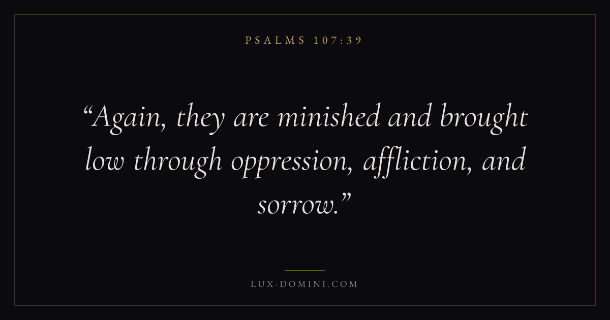 Books / Psalms / Chapter 107 / Verse 39 ← Psalms 107:38 Psalms 107:39 Psalms 107:40 → Again, they are minished and brought low through oppression, affliction, and sorrow. Download verse card Share on Twitter Share on Facebook Pin it ✦ Key themes FaithSuffering and trialsPrayerPraise Read with Hebrews 11:1Romans 10:17Romans 8:182 Corinthians 4:17 Related topics Bible verses about faithBible verses about suffering and trialsBible verses about prayerBible verses about thankfulness and gratitude ✦ Psalms Chapter 107 verses V. 1 V. 2 V. 3 V. 4 V. 5 V. 6 V. 7 V. 8 V. 9 V. 10 V. 11 V. 12 V. 13 V. 14 V. 15 V. 16 V. 17 V. 18 V. 19 V. 20 V. 21 V. 22 V. 23 V. 24 V. 25 V. 26 V. 27 V. 28 V. 29 V. 30 V. 31 V. 32 V. 33 V. 34 V. 35 V. 36 V. 37 V. 38 V. 39 V. 40 V. 41 V. 42 V. 43