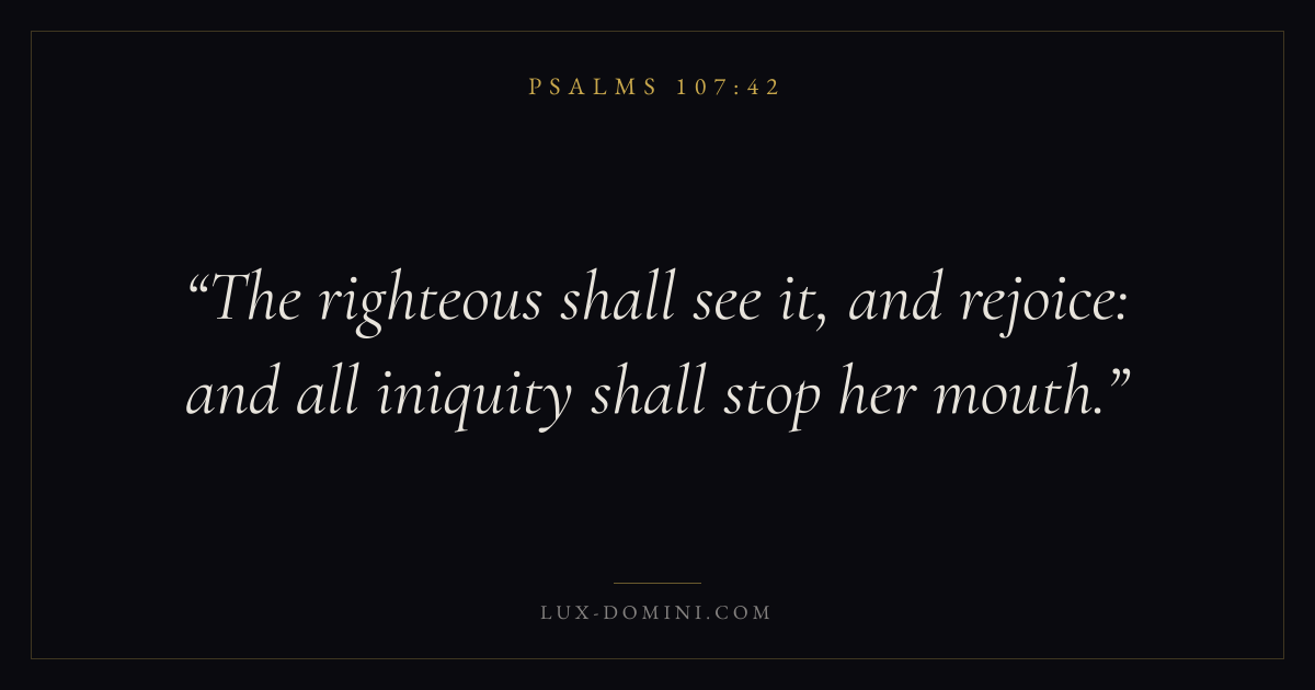 Books / Psalms / Chapter 107 / Verse 42 ← Psalms 107:41 Psalms 107:42 Psalms 107:43 → The righteous shall see it, and rejoice: and all iniquity shall stop her mouth. Download verse card Share on Twitter Share on Facebook Pin it ✦ Key themes FaithPrayerPraiseLament Read with Hebrews 11:1Romans 10:17Matthew 6:9Luke 18:1 Related topics Bible verses about faithBible verses about prayerBible verses about thankfulness and gratitudeBible verses about grief and loss ✦ Psalms Chapter 107 verses V. 1 V. 2 V. 3 V. 4 V. 5 V. 6 V. 7 V. 8 V. 9 V. 10 V. 11 V. 12 V. 13 V. 14 V. 15 V. 16 V. 17 V. 18 V. 19 V. 20 V. 21 V. 22 V. 23 V. 24 V. 25 V. 26 V. 27 V. 28 V. 29 V. 30 V. 31 V. 32 V. 33 V. 34 V. 35 V. 36 V. 37 V. 38 V. 39 V. 40 V. 41 V. 42 V. 43