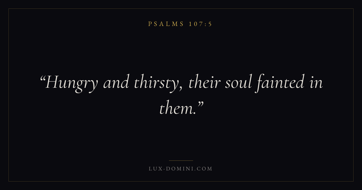 Books / Psalms / Chapter 107 / Verse 5 ← Psalms 107:4 Psalms 107:5 Psalms 107:6 → Hungry and thirsty, their soul fainted in them. Download verse card Share on Twitter Share on Facebook Pin it ✦ Key themes FaithPrayerSalvationPraise Read with Hebrews 11:1Romans 10:17Matthew 6:9Luke 18:1 Related topics Bible verses about faithBible verses about prayerBible verses about salvationBible verses about thankfulness and gratitude ✦ Psalms Chapter 107 verses V. 1 V. 2 V. 3 V. 4 V. 5 V. 6 V. 7 V. 8 V. 9 V. 10 V. 11 V. 12 V. 13 V. 14 V. 15 V. 16 V. 17 V. 18 V. 19 V. 20 V. 21 V. 22 V. 23 V. 24 V. 25 V. 26 V. 27 V. 28 V. 29 V. 30 V. 31 V. 32 V. 33 V. 34 V. 35 V. 36 V. 37 V. 38 V. 39 V. 40 V. 41 V. 42 V. 43