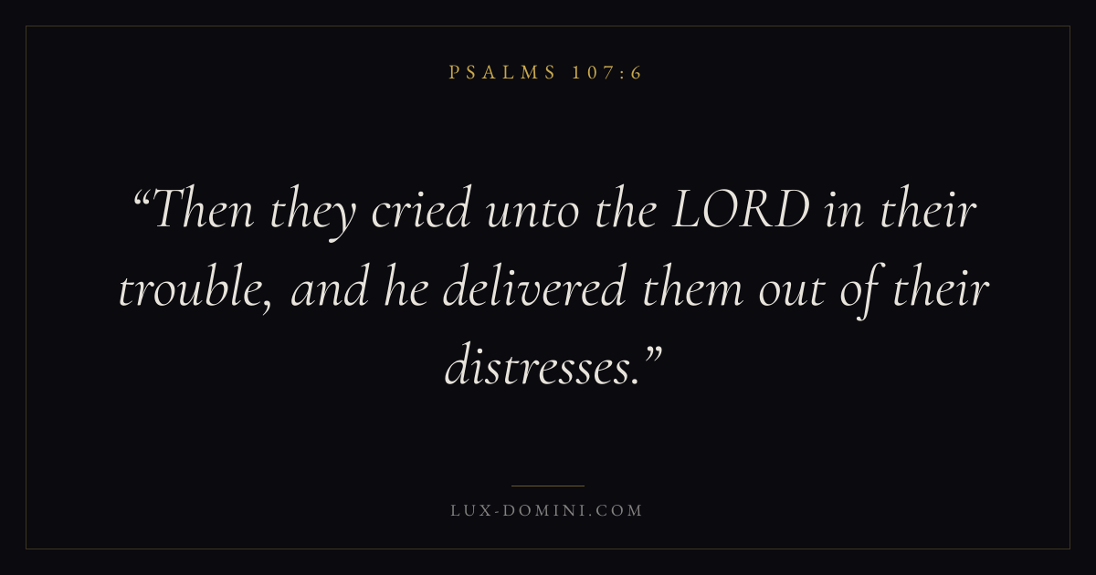 Books / Psalms / Chapter 107 / Verse 6 ← Psalms 107:5 Psalms 107:6 Psalms 107:7 → Then they cried unto the LORD in their trouble, and he delivered them out of their distresses. Download verse card Share on Twitter Share on Facebook Pin it ✦ Key themes FaithPrayerSalvationPraise Read with Hebrews 11:1Romans 10:17Matthew 6:9Luke 18:1 Related topics Bible verses about faithBible verses about prayerBible verses about salvationBible verses about thankfulness and gratitude ✦ Psalms Chapter 107 verses V. 1 V. 2 V. 3 V. 4 V. 5 V. 6 V. 7 V. 8 V. 9 V. 10 V. 11 V. 12 V. 13 V. 14 V. 15 V. 16 V. 17 V. 18 V. 19 V. 20 V. 21 V. 22 V. 23 V. 24 V. 25 V. 26 V. 27 V. 28 V. 29 V. 30 V. 31 V. 32 V. 33 V. 34 V. 35 V. 36 V. 37 V. 38 V. 39 V. 40 V. 41 V. 42 V. 43