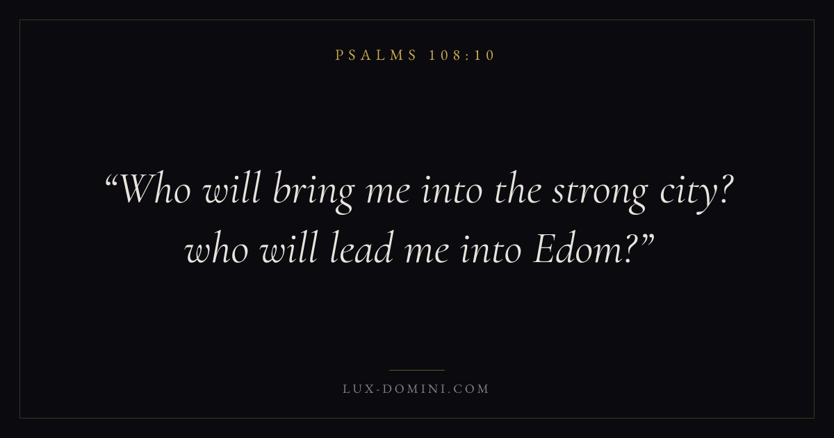Books / Psalms / Chapter 108 / Verse 10 ← Psalms 108:9 Psalms 108:10 Psalms 108:11 → Who will bring me into the strong city? who will lead me into Edom? Download verse card Share on Twitter Share on Facebook Pin it ✦ Key themes FaithPrayerPraiseLament Read with Hebrews 11:1Romans 10:17Matthew 6:9Luke 18:1 Related topics Bible verses about faithBible verses about prayerBible verses about thankfulness and gratitudeBible verses about grief and loss Glossary Edom Place Biblical region. Modern identification: Buseira. City People The earliest mention of city-building is that of Enoch, which was built by Cain ( Gen. 4:17 ). After the confusion of tongues, the descendants of Nimrod founded several cities (10:10-12). ✦ Psalms Chapter 108 verses V. 1 V. 2 V. 3 V. 4 V. 5 V. 6 V. 7 V. 8 V. 9 V. 10 V. 11 V. 12 V. 13