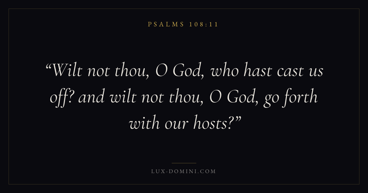 Books / Psalms / Chapter 108 / Verse 11 ← Psalms 108:10 Psalms 108:11 Psalms 108:12 → Wilt not thou, O God, who hast cast us off? and wilt not thou, O God, go forth with our hosts? Download verse card Share on Twitter Share on Facebook Pin it ✦ Key themes FaithPrayerPraiseLament Read with Hebrews 11:1Romans 10:17Matthew 6:9Luke 18:1 Related topics Bible verses about faithBible verses about prayerBible verses about thankfulness and gratitudeBible verses about grief and loss ✦ Psalms Chapter 108 verses V. 1 V. 2 V. 3 V. 4 V. 5 V. 6 V. 7 V. 8 V. 9 V. 10 V. 11 V. 12 V. 13