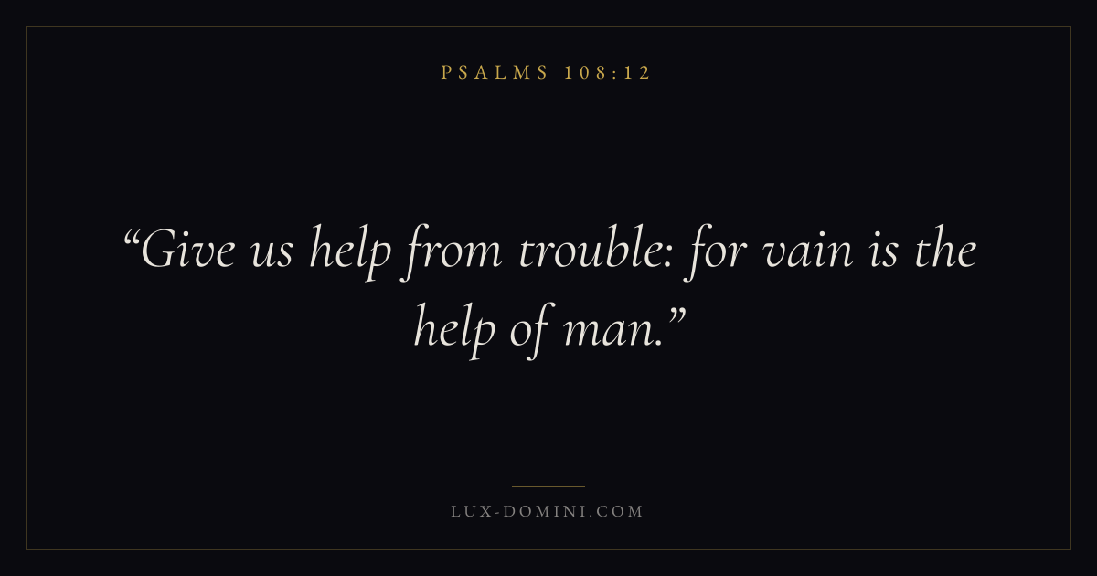 Books / Psalms / Chapter 108 / Verse 12 ← Psalms 108:11 Psalms 108:12 Psalms 108:13 → Give us help from trouble: for vain is the help of man. Download verse card Share on Twitter Share on Facebook Pin it ✦ Key themes FaithPrayerPraiseLament Read with Hebrews 11:1Romans 10:17Matthew 6:9Luke 18:1 Related topics Bible verses about faithBible verses about prayerBible verses about thankfulness and gratitudeBible verses about grief and loss ✦ Psalms Chapter 108 verses V. 1 V. 2 V. 3 V. 4 V. 5 V. 6 V. 7 V. 8 V. 9 V. 10 V. 11 V. 12 V. 13