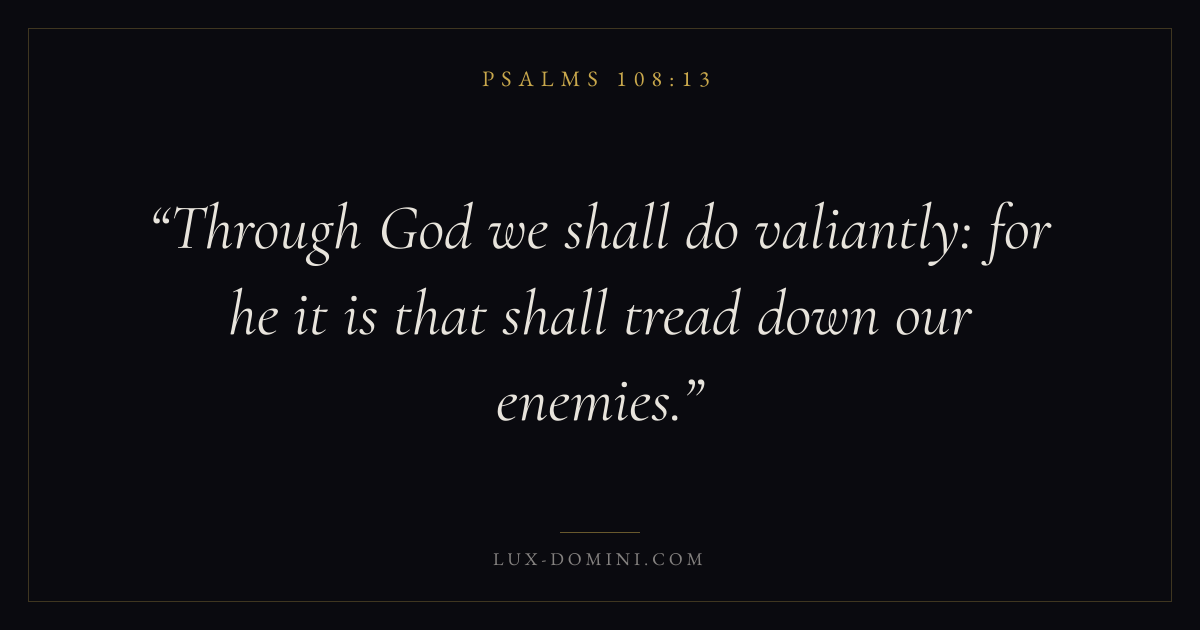 Books / Psalms / Chapter 108 / Verse 13 ← Psalms 108:12 Psalms 108:13 Psalms 109:1 → Through God we shall do valiantly: for he it is that shall tread down our enemies. Download verse card Share on Twitter Share on Facebook Pin it ✦ Key themes FaithPrayerPraiseLament Read with Hebrews 11:1Romans 10:17Matthew 6:9Luke 18:1 Related topics Bible verses about faithBible verses about prayerBible verses about thankfulness and gratitudeBible verses about grief and loss ✦ Psalms Chapter 108 verses V. 1 V. 2 V. 3 V. 4 V. 5 V. 6 V. 7 V. 8 V. 9 V. 10 V. 11 V. 12 V. 13