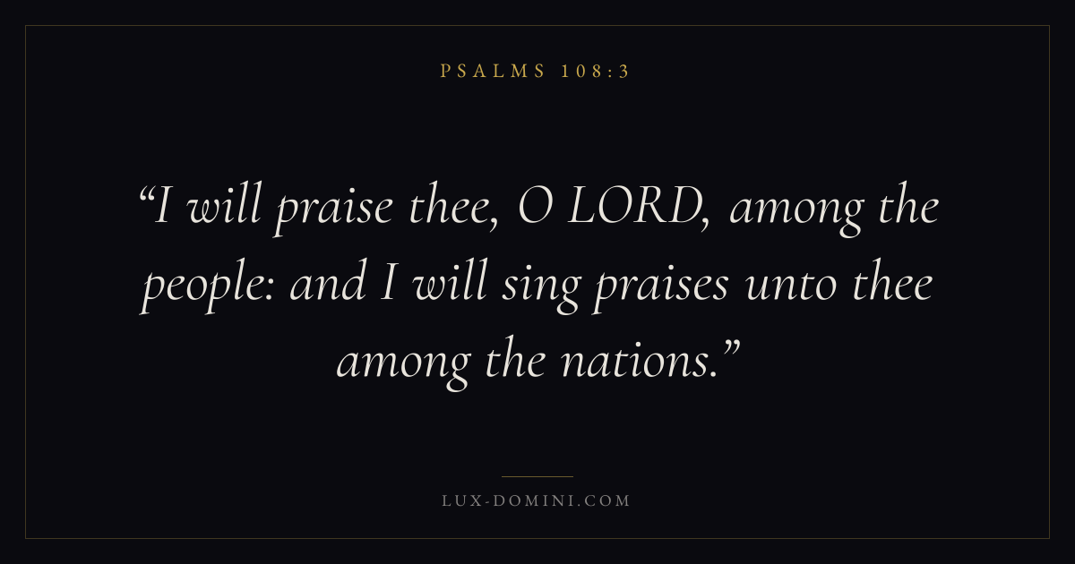 Books / Psalms / Chapter 108 / Verse 3 ← Psalms 108:2 Psalms 108:3 Psalms 108:4 → I will praise thee, O LORD, among the people: and I will sing praises unto thee among the nations. Download verse card Share on Twitter Share on Facebook Pin it ✦ Key themes FaithPrayerPraiseLament Read with Hebrews 11:1Romans 10:17Matthew 6:9Luke 18:1 Related topics Bible verses about faithBible verses about prayerBible verses about thankfulness and gratitudeBible verses about grief and loss ✦ Psalms Chapter 108 verses V. 1 V. 2 V. 3 V. 4 V. 5 V. 6 V. 7 V. 8 V. 9 V. 10 V. 11 V. 12 V. 13