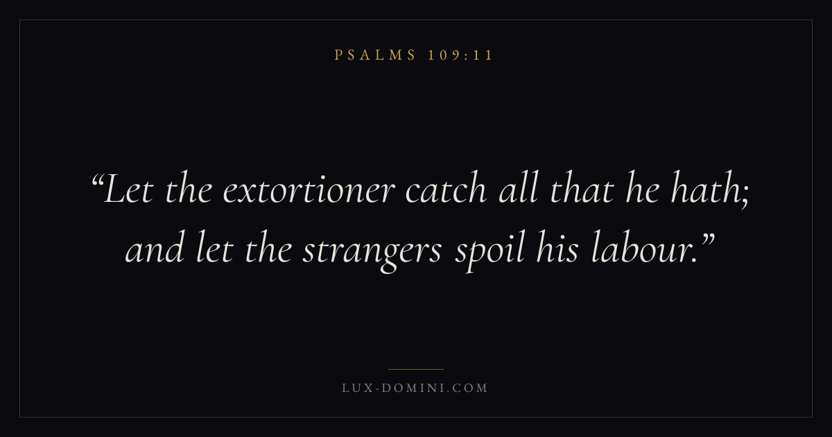 Books / Psalms / Chapter 109 / Verse 11 ← Psalms 109:10 Psalms 109:11 Psalms 109:12 → Let the extortioner catch all that he hath; and let the strangers spoil his labour. Download verse card Share on Twitter Share on Facebook Pin it ✦ Key themes FaithPrayerJustice and mercySalvationPraise Read with Hebrews 11:1Romans 10:17Matthew 6:9Luke 18:1 Related topics Bible verses about faithBible verses about prayerBible verses about justice and mercyBible verses about salvationBible verses about thankfulness and gratitude ✦ Psalms Chapter 109 verses V. 1 V. 2 V. 3 V. 4 V. 5 V. 6 V. 7 V. 8 V. 9 V. 10 V. 11 V. 12 V. 13 V. 14 V. 15 V. 16 V. 17 V. 18 V. 19 V. 20 V. 21 V. 22 V. 23 V. 24 V. 25 V. 26 V. 27 V. 28 V. 29 V. 30 V. 31