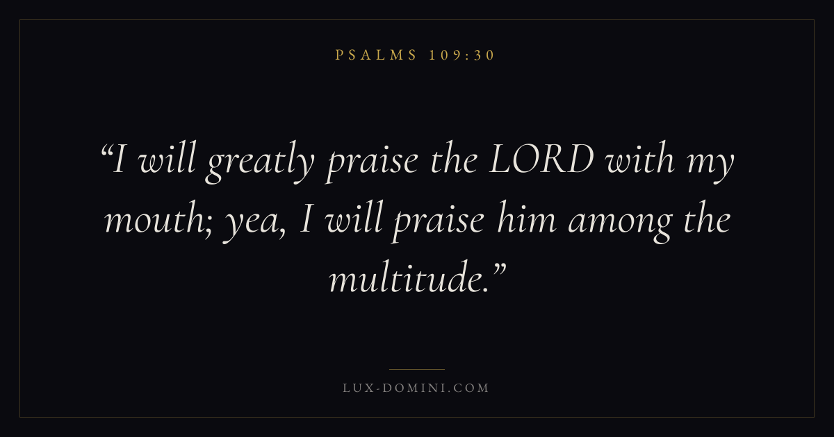 Books / Psalms / Chapter 109 / Verse 30 ← Psalms 109:29 Psalms 109:30 Psalms 109:31 → I will greatly praise the LORD with my mouth; yea, I will praise him among the multitude. Download verse card Share on Twitter Share on Facebook Pin it ✦ Key themes FaithAnxiety and fearPrayerHumilityPraise Read with Hebrews 11:1Romans 10:17Philippians 4:6Isaiah 41:10 Related topics Bible verses about faithBible verses about anxiety and fearBible verses about prayerBible verses about humilityBible verses about thankfulness and gratitude ✦ Psalms Chapter 109 verses V. 1 V. 2 V. 3 V. 4 V. 5 V. 6 V. 7 V. 8 V. 9 V. 10 V. 11 V. 12 V. 13 V. 14 V. 15 V. 16 V. 17 V. 18 V. 19 V. 20 V. 21 V. 22 V. 23 V. 24 V. 25 V. 26 V. 27 V. 28 V. 29 V. 30 V. 31