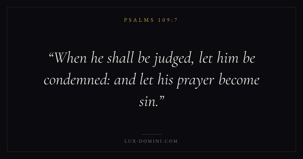 Books / Psalms / Chapter 109 / Verse 7 ← Psalms 109:6 Psalms 109:7 Psalms 109:8 → When he shall be judged, let him be condemned: and let his prayer become sin. Download verse card Share on Twitter Share on Facebook Pin it ✦ Key themes FaithPrayerJustice and mercySalvationPraise Read with Hebrews 11:1Romans 10:17Matthew 6:9Luke 18:1 Related topics Bible verses about faithBible verses about prayerBible verses about justice and mercyBible verses about salvationBible verses about thankfulness and gratitude ✦ Psalms Chapter 109 verses V. 1 V. 2 V. 3 V. 4 V. 5 V. 6 V. 7 V. 8 V. 9 V. 10 V. 11 V. 12 V. 13 V. 14 V. 15 V. 16 V. 17 V. 18 V. 19 V. 20 V. 21 V. 22 V. 23 V. 24 V. 25 V. 26 V. 27 V. 28 V. 29 V. 30 V. 31