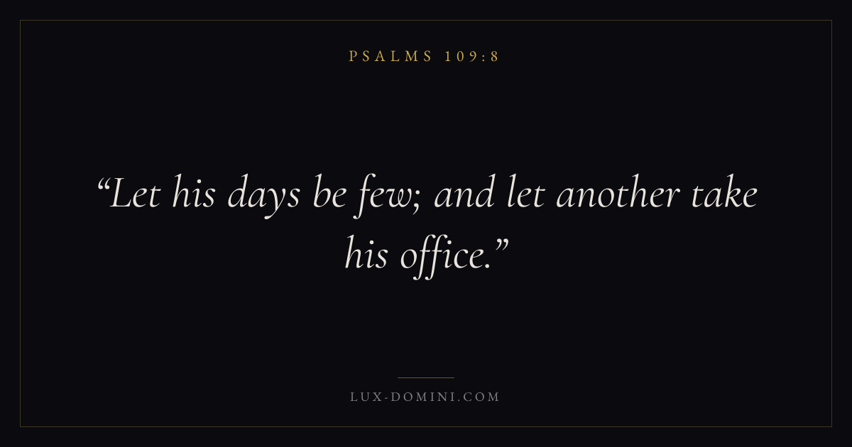 Books / Psalms / Chapter 109 / Verse 8 ← Psalms 109:7 Psalms 109:8 Psalms 109:9 → Let his days be few; and let another take his office. Download verse card Share on Twitter Share on Facebook Pin it ✦ Key themes FaithPrayerJustice and mercySalvationPraise Read with Hebrews 11:1Romans 10:17Matthew 6:9Luke 18:1 Related topics Bible verses about faithBible verses about prayerBible verses about justice and mercyBible verses about salvationBible verses about thankfulness and gratitude ✦ Psalms Chapter 109 verses V. 1 V. 2 V. 3 V. 4 V. 5 V. 6 V. 7 V. 8 V. 9 V. 10 V. 11 V. 12 V. 13 V. 14 V. 15 V. 16 V. 17 V. 18 V. 19 V. 20 V. 21 V. 22 V. 23 V. 24 V. 25 V. 26 V. 27 V. 28 V. 29 V. 30 V. 31