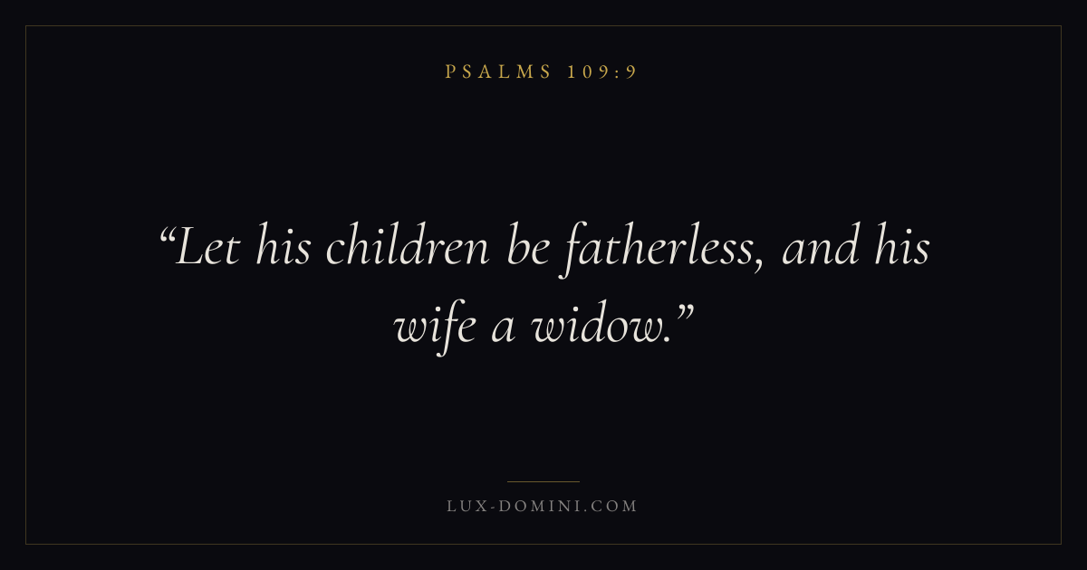 Books / Psalms / Chapter 109 / Verse 9 ← Psalms 109:8 Psalms 109:9 Psalms 109:10 → Let his children be fatherless, and his wife a widow. Download verse card Share on Twitter Share on Facebook Pin it ✦ Key themes FaithPrayerJustice and mercySalvationPraise Read with Hebrews 11:1Romans 10:17Matthew 6:9Luke 18:1 Related topics Bible verses about faithBible verses about prayerBible verses about justice and mercyBible verses about salvationBible verses about thankfulness and gratitude ✦ Psalms Chapter 109 verses V. 1 V. 2 V. 3 V. 4 V. 5 V. 6 V. 7 V. 8 V. 9 V. 10 V. 11 V. 12 V. 13 V. 14 V. 15 V. 16 V. 17 V. 18 V. 19 V. 20 V. 21 V. 22 V. 23 V. 24 V. 25 V. 26 V. 27 V. 28 V. 29 V. 30 V. 31