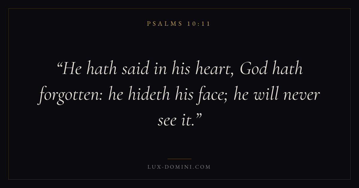 Books / Psalms / Chapter 10 / Verse 11 ← Psalms 10:10 Psalms 10:11 Psalms 10:12 → He hath said in his heart, God hath forgotten: he hideth his face; he will never see it. Download verse card Share on Twitter Share on Facebook Pin it ✦ Key themes FaithPrayerPraiseLament Read with Hebrews 11:1Romans 10:17Matthew 6:9Luke 18:1 Related topics Bible verses about faithBible verses about prayerBible verses about thankfulness and gratitudeBible verses about grief and loss ✦ Psalms Chapter 10 verses V. 1 V. 2 V. 3 V. 4 V. 5 V. 6 V. 7 V. 8 V. 9 V. 10 V. 11 V. 12 V. 13 V. 14 V. 15 V. 16 V. 17 V. 18