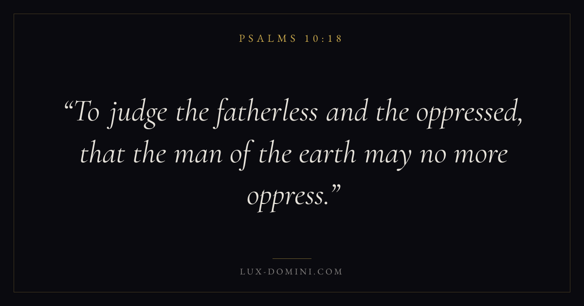 Books / Psalms / Chapter 10 / Verse 18 ← Psalms 10:17 Psalms 10:18 Psalms 11:1 → To judge the fatherless and the oppressed, that the man of the earth may no more oppress. Download verse card Share on Twitter Share on Facebook Pin it ✦ Key themes FaithPrayerJustice and mercyPraise Read with Hebrews 11:1Romans 10:17Matthew 6:9Luke 18:1 Related topics Bible verses about faithBible verses about prayerBible verses about justice and mercyBible verses about thankfulness and gratitude ✦ Psalms Chapter 10 verses V. 1 V. 2 V. 3 V. 4 V. 5 V. 6 V. 7 V. 8 V. 9 V. 10 V. 11 V. 12 V. 13 V. 14 V. 15 V. 16 V. 17 V. 18