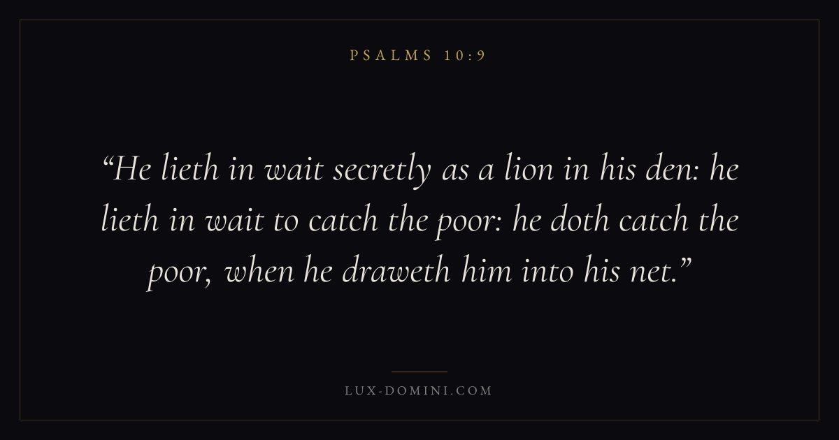 He lieth in wait secretly as a lion in his den: he lieth in wait to catch the poor: he doth catch the poor, when he draweth him into his net.