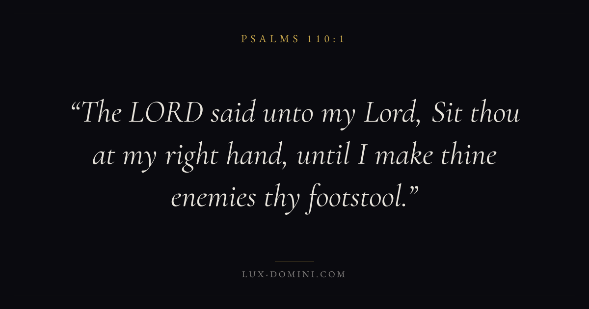 Books / Psalms / Chapter 110 / Verse 1 ← Psalms 109:31 Psalms 110:1 Psalms 110:2 → The LORD said unto my Lord, Sit thou at my right hand, until I make thine enemies thy footstool. Download verse card Share on Twitter Share on Facebook Pin it ✦ Key themes FaithPrayerPraiseLament Read with Hebrews 11:1Romans 10:17Matthew 6:9Luke 18:1 Related topics Bible verses about faithBible verses about prayerBible verses about thankfulness and gratitudeBible verses about grief and loss ✦ Psalms Chapter 110 verses V. 1 V. 2 V. 3 V. 4 V. 5 V. 6 V. 7