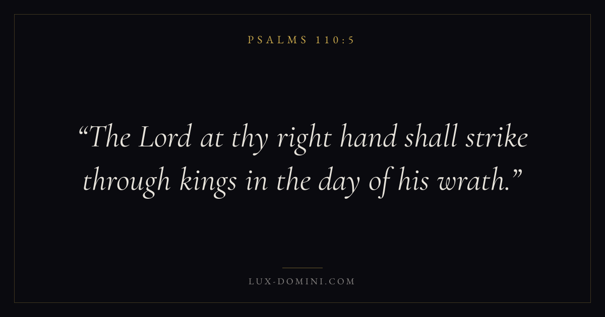 Books / Psalms / Chapter 110 / Verse 5 ← Psalms 110:4 Psalms 110:5 Psalms 110:6 → The Lord at thy right hand shall strike through kings in the day of his wrath. Download verse card Share on Twitter Share on Facebook Pin it ✦ Key themes FaithPrayerPraiseLament Read with Hebrews 11:1Romans 10:17Matthew 6:9Luke 18:1 Related topics Bible verses about faithBible verses about prayerBible verses about thankfulness and gratitudeBible verses about grief and loss ✦ Psalms Chapter 110 verses V. 1 V. 2 V. 3 V. 4 V. 5 V. 6 V. 7