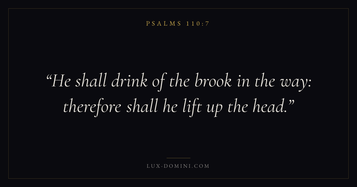 Books / Psalms / Chapter 110 / Verse 7 ← Psalms 110:6 Psalms 110:7 Psalms 111:1 → He shall drink of the brook in the way: therefore shall he lift up the head. Download verse card Share on Twitter Share on Facebook Pin it ✦ Key themes FaithPrayerPraiseLament Read with Hebrews 11:1Romans 10:17Matthew 6:9Luke 18:1 Related topics Bible verses about faithBible verses about prayerBible verses about thankfulness and gratitudeBible verses about grief and loss ✦ Psalms Chapter 110 verses V. 1 V. 2 V. 3 V. 4 V. 5 V. 6 V. 7